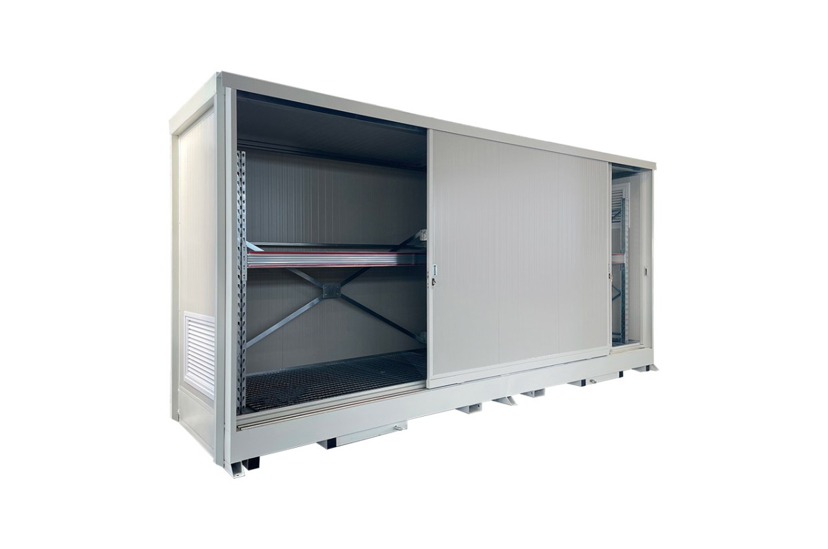 Container stoccaggio fusti su scaffale in pannelli coibentati